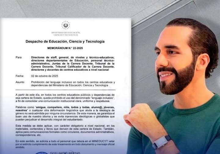 San Salvador, 3 de octubre de 2025 — En una decisión que ha generado polémica y debate, el gobierno del presidente Nayib Bukele emitió un memorándum oficial que prohíbe el uso de expresiones propias del “lenguaje inclusivo” —como “amigue, niñe, alumn@, todxs o nosotrxs”— en todos los materiales escolares, circulares y comunicaciones oficiales, a partir del 2 de octubre.