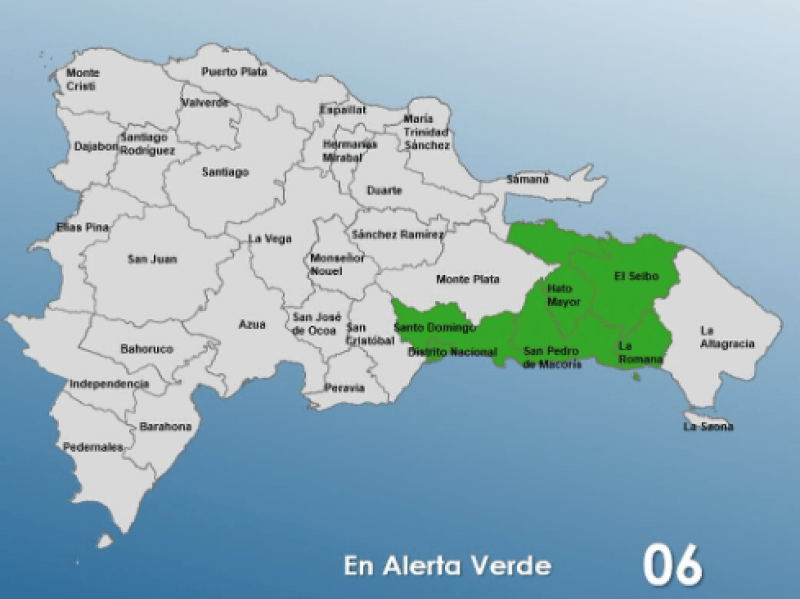 Las provincias bajo alerta son: Santo Domingo, San Pedro de Macorís, El Seibo, Distrito Nacional, La Romana y Hato Mayor.