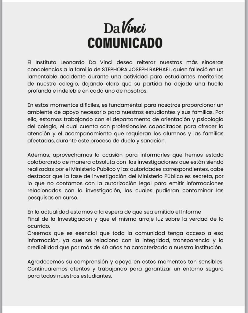 Santiago.– El Instituto Leonardo Da Vinci emitió este sábado una comunicación oficial en la que expresa sus condolencias por la muerte de la niña Stephora Joseph Raphael, fallecida durante una excursión escolar el pasado 14 de noviembre, más de dos semanas después del hecho y sin ofrecer información sobre las circunstancias del accidente que ha conmocionado al país.