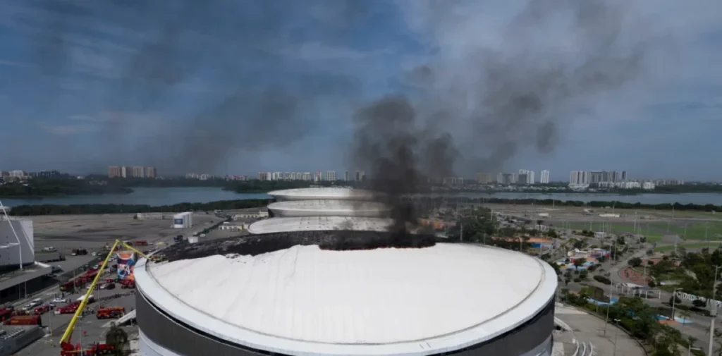 El Cuerpo de Bomberos informó que el fuego estaba bajo control y se limitó principalmente al techo de lona del recinto deportivo sin causar heridos.