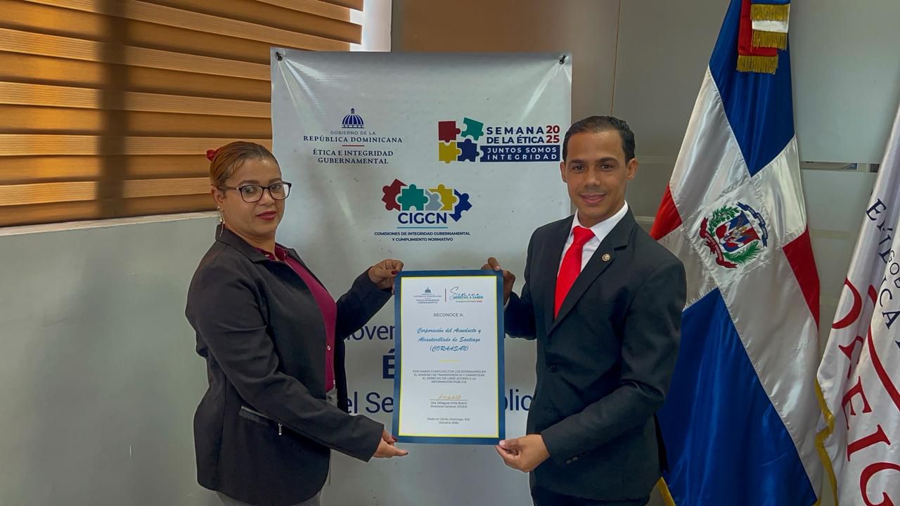 Santiago. RD.- La Corporación del Acueducto y Alcantarillado de Santiago (Coraasan), recibió de la Dirección General de Ética e Integridad Gubernamental (DIGEIG), un reconocimiento por la transparencia en los procesos institucionales, consolidando su liderazgo en el sector agua y saneamiento.