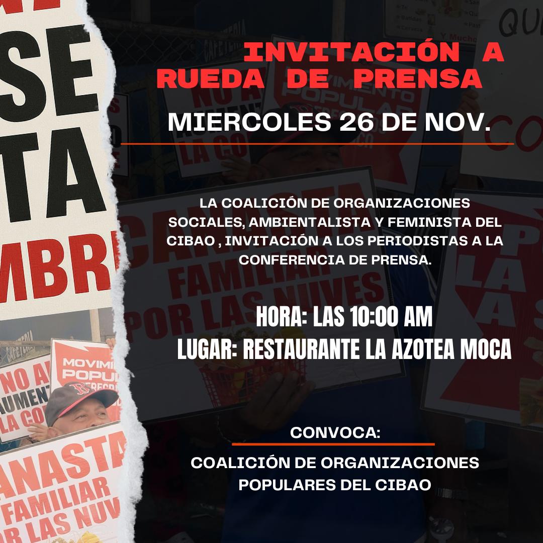 Moca, provincia Espaillat. – La Coalición de Organizaciones Sociales, Ambientalistas y Feministas del Cibao convocó a todos los medios de comunicación locales, regionales y nacionales. Han llamado a una rueda de prensa que se celebrará este miércoles 26 de noviembre, a las 10:00 de la mañana, en el restaurante La Azotea, ubicado en el municipio de Moca.