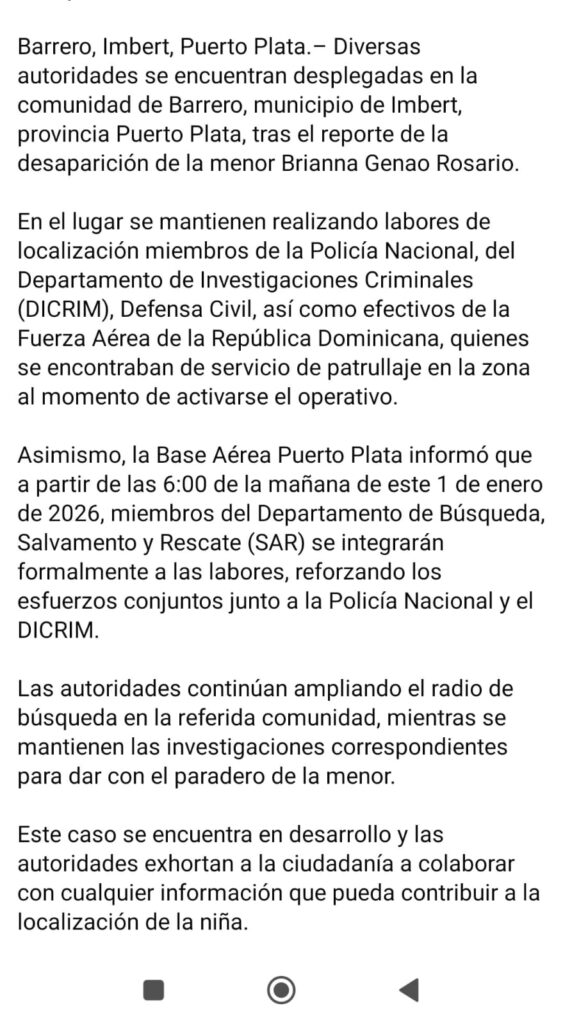 EL CIBAO Comunidad y autoridades en Imbert, Puerto Plata buscan menor desaparecida 01/01/2026 1 min read Comparte lo en tus redes!!! Comparte lo en tus redes!!! Continue Reading Previous: Río de Janeiro rompe récord como sede de la mayor fiesta de Fin de Año mundialNext: Atrapan en Puerto Plata joven haitiano señalado por múltiples asaltos armados Historia Relacionada Operativo policial captura a dominicanos que movilizaban 15 haitianos indocumentados 1 min read EL CIBAO Operativo policial captura a dominicanos que movilizaban 15 haitianos indocumentados 17/01/2026 Policía Nacional busca a “El Deportado” en Santiago por presunto homicidio; considerado altamente peligroso 1 min read EL CIBAO Policía Nacional busca a “El Deportado” en Santiago por presunto homicidio; considerado altamente peligroso 17/01/2026 “Mami aún espera por ti”: madre de Brianna llama a marcha tras 16 días sin hallarla 1 min read EL CIBAO “Mami aún espera por ti”: madre de Brianna llama a marcha tras 16 días sin hallarla 17/01/2026 Autoridades reportan en Constanza muerte de hombre y destrucción de caseta ligada a narcóticos 1 min read EL CIBAO Autoridades reportan en Constanza muerte de hombre y destrucción de caseta ligada a narcóticos 17/01/2026 Joven de 16 años muere tras colisionar con un caballo en accidente vial 1 min read EL CIBAO Joven de 16 años muere tras colisionar con un caballo en accidente vial 16/01/2026 Policía Nacional incauta drogas, motocicletas y arma de fuego durante operativo en Las Canas, La Vega 1 min read EL CIBAO Policía Nacional incauta drogas, motocicletas y arma de fuego durante operativo en Las Canas, La Vega 16/01/2026