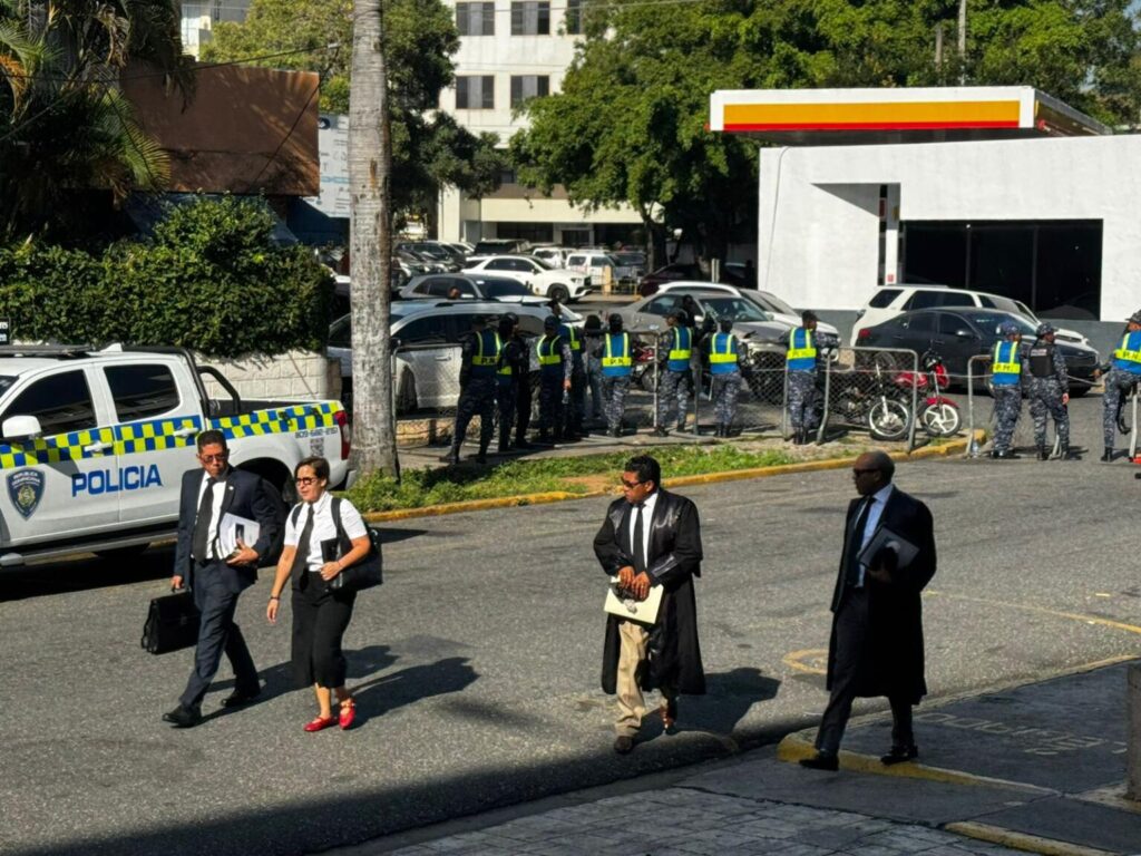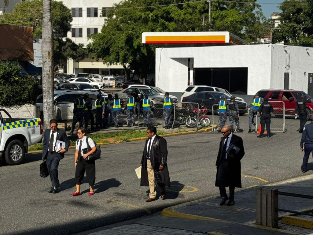 Inmediaciones del Palacio de Justicia lucieron acordonadas con efectivos policiales previo al conocimiento de audiencia, reflejando seguridad reforzada ante expectativa nacional creciente.