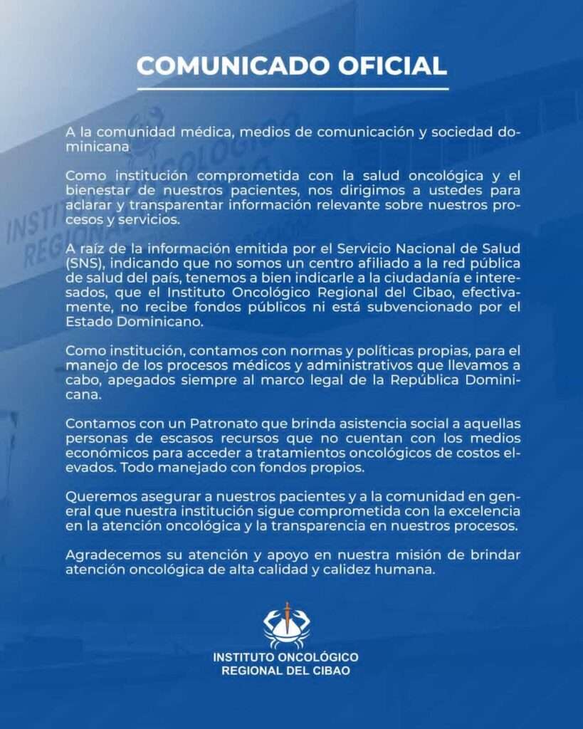 Santiago, R.D. – El Instituto Oncológico Regional del Cibao informó a la comunidad médica, a los medios de comunicación y a la sociedad en general, que no pertenece a la red pública de salud del país ni recibe fondos estatales, en respuesta a informaciones recientes emitidas por el Servicio Nacional de Salud (SNS).