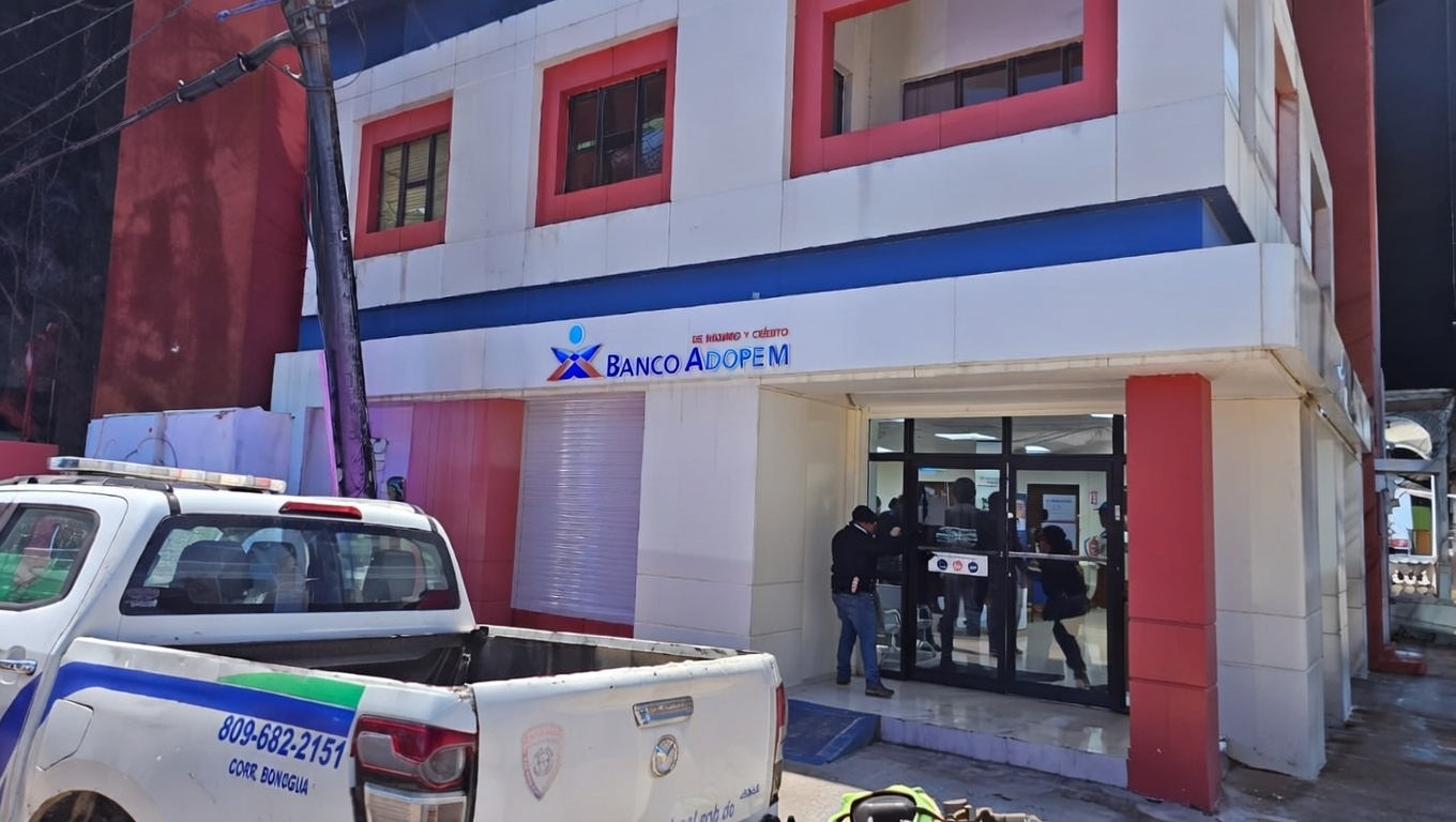 Policía Nacional investiga intento robo en sucursal Banco Adopem La Vega, donde presunto autor accedió establecimiento sin lograr sustraer dinero ni bienes valor.