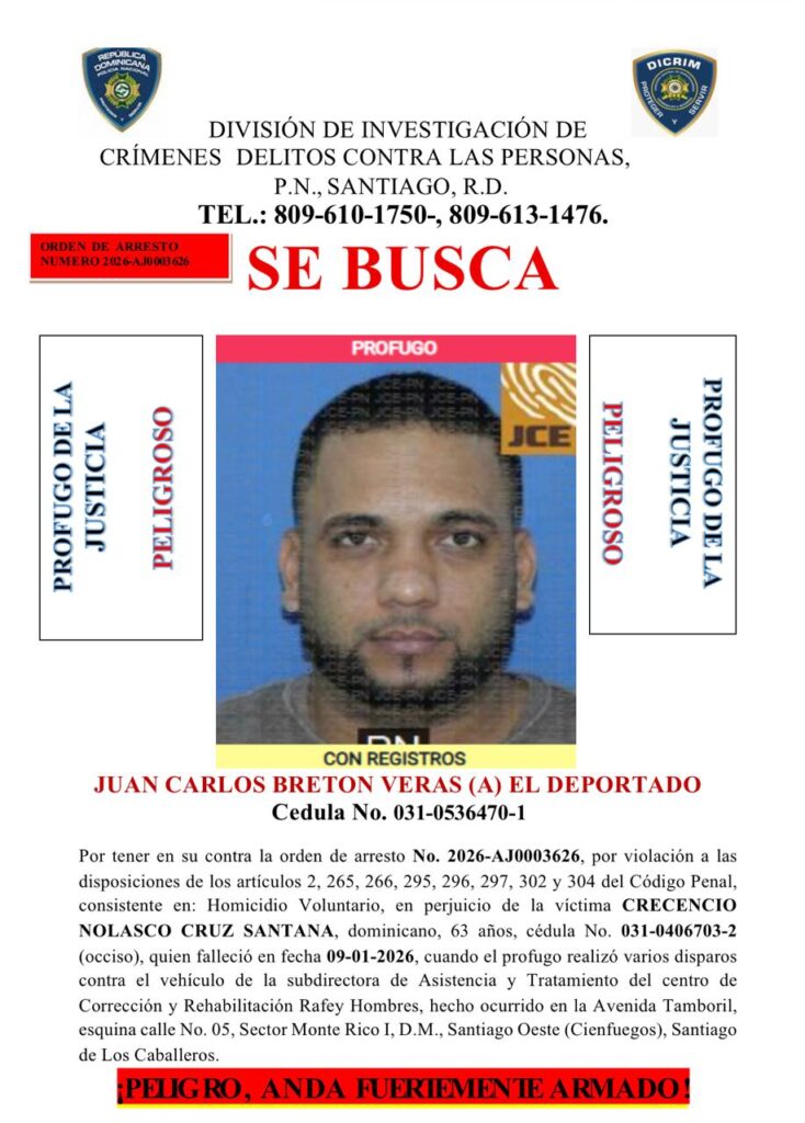 Policía Nacional informó prófugo Juan Carlos Bretón Veras, alias “El Deportado”, considerado altamente peligroso, con orden arresto No. 2026-AJ0003626 vigente.