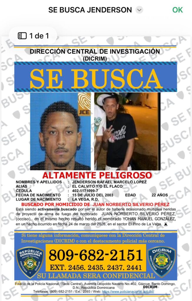 La Policía Nacional informó el arresto de Jenderson Rafael Marcelo López alias El Calvito buscado por su presunta participación en un homicidio.