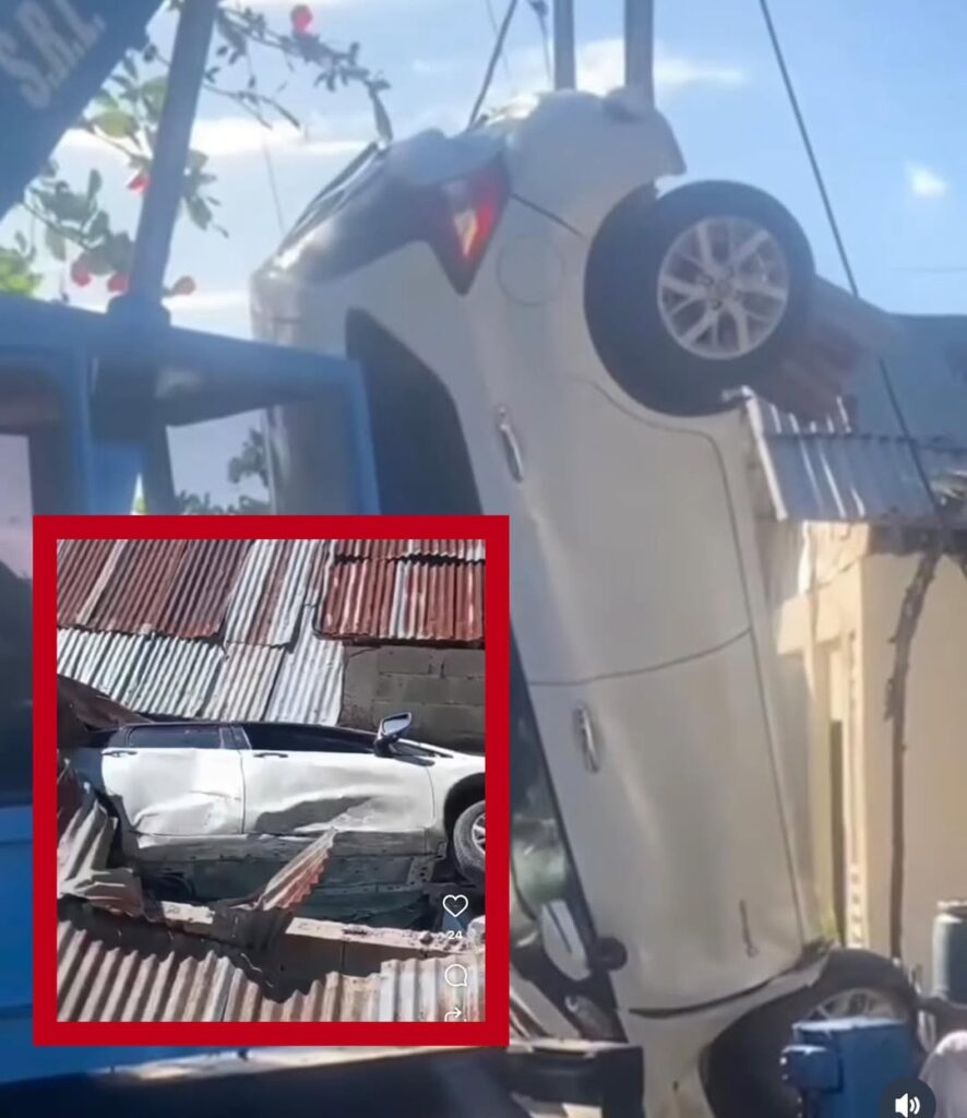 En Santiago, una jeepeta cayó sobre vivienda de zinc en sector Los Prados de Pekín, tras conductor perder control del vehículo durante la tarde.