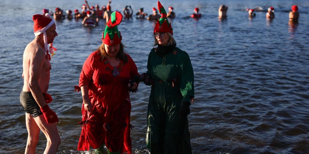 Berlín.– Docenas de personas con gorros de Papá Noel se bañaron en Navidad en lago Orankesee, pese a temperaturas bajo cero.