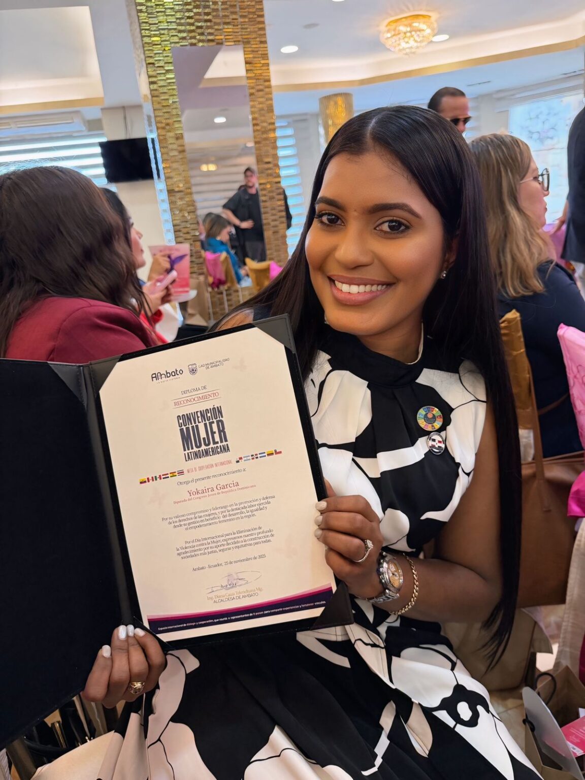 Ambato, Ecuador. – La Licenciada Yokaira García Bonilla, diputada voluntaria del Congreso Joven de la República Dominicana, Directora Nacional de la Mujer para la Red Mundial de Jóvenes Políticos (capítulo República Dominicana) y presidenta de la Fundación Regalando Sonrisas, fue reconocida por su destacado liderazgo y su firme compromiso social en favor de los derechos de la mujer.