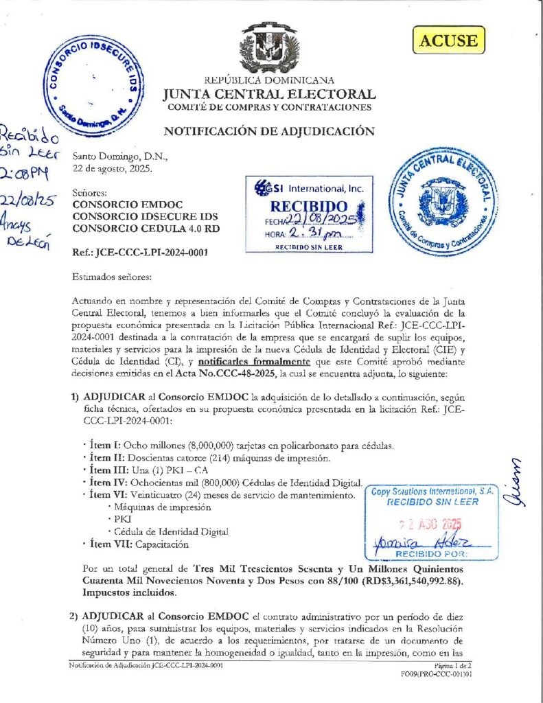 Santo Domingo.- La Junta Central Electoral, a través de su Comité de Compras y Contrataciones, notificó mediante el Acta No. CCC-48-2025 la adjudicación al consorcio EMDOC, integrado por las empresas GSI Internacional Inc, IQtek Solutions, Muhlbauer, Ultra Tech, Veridos), con el objetivo de que supla a la institución de los equipos, materiales y servicios para la renovación de la Cédula de Identidad y Cédula de Identidad y Electoral.