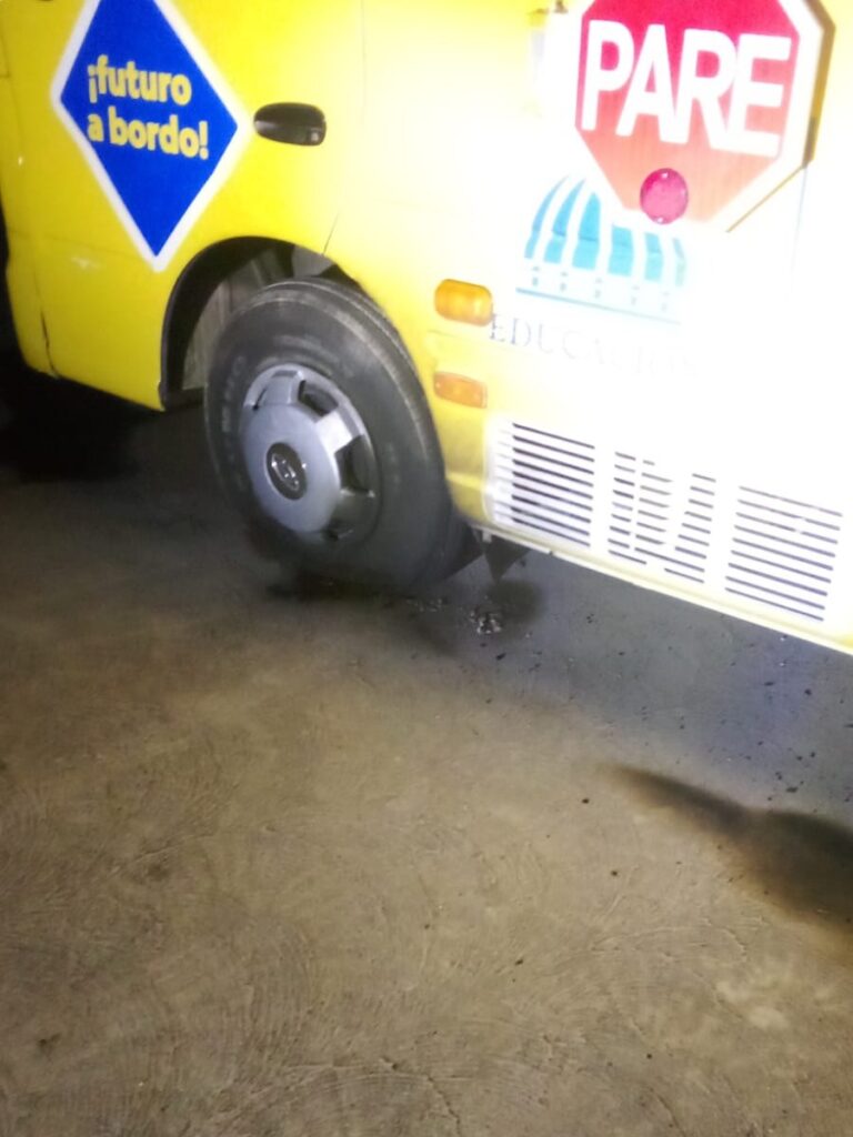 Personas aún no identificadas incendiaron neumáticos del lado izquierdo de un autobús escolar estacionado en la Escuela Juan Pablo Duarte, sector San Carlos, Quisqueya.