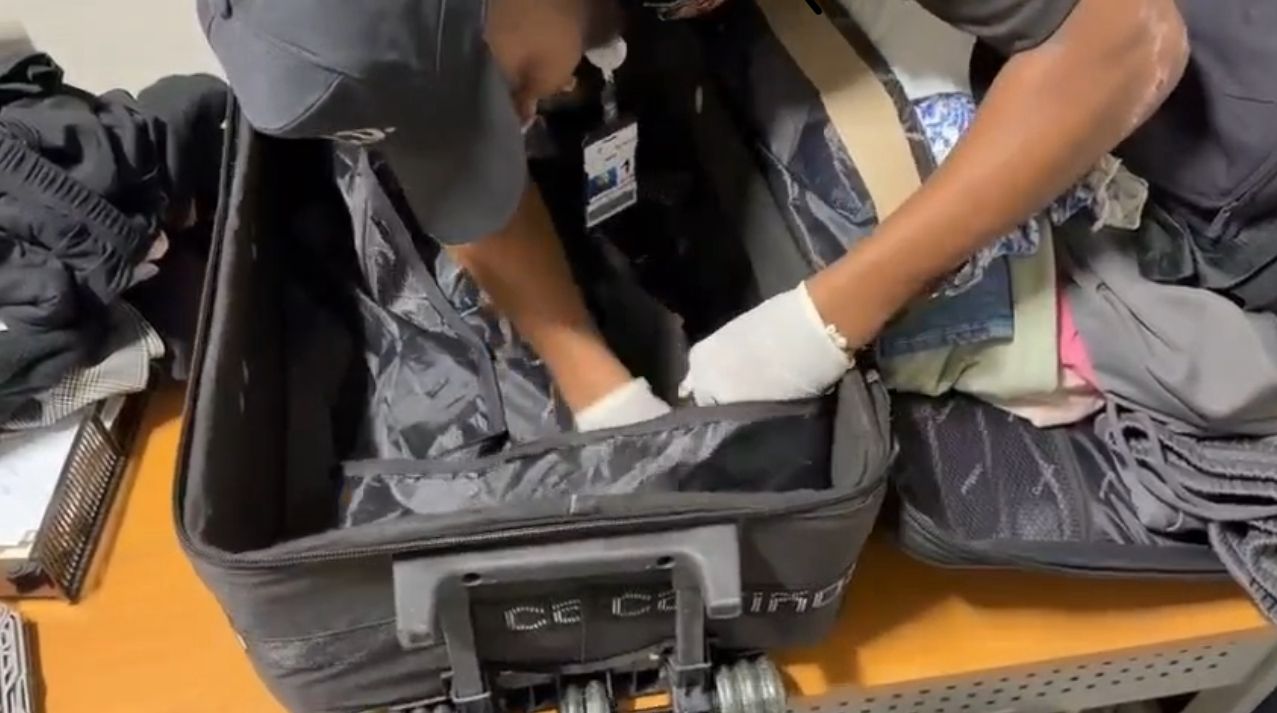 Agentes de la DNCD, junto al Ministerio Público, detectaron dos láminas con polvo blanco ocultas dentro de dos maletas durante una inspección rutinaria.