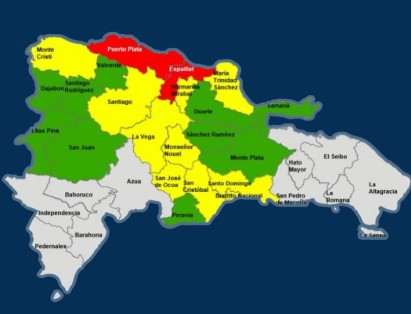 En alerta roja se encuentran actualmente Puerto Plata y Espaillat mientras en amarilla figuran Monte Cristi y María Trinidad Sánchez junto a la provincia Hermanas Mirabal.