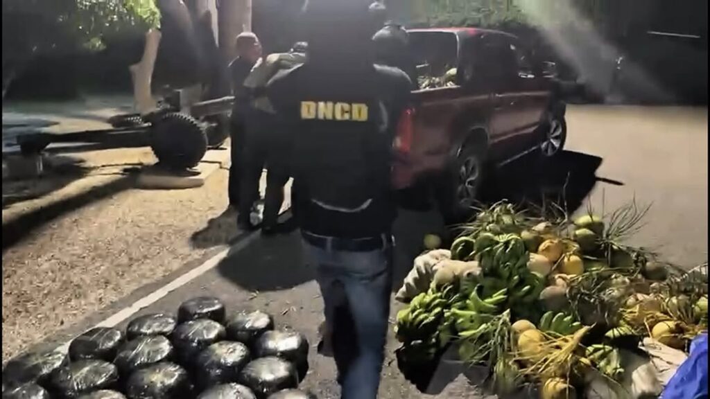 Antinarcóticos interceptaron camioneta en puesto militar Santa Elena, carretera Barahona–Paraíso, transportando carga oculta de sustancias narcóticas camufladas entre frutas tropicales.