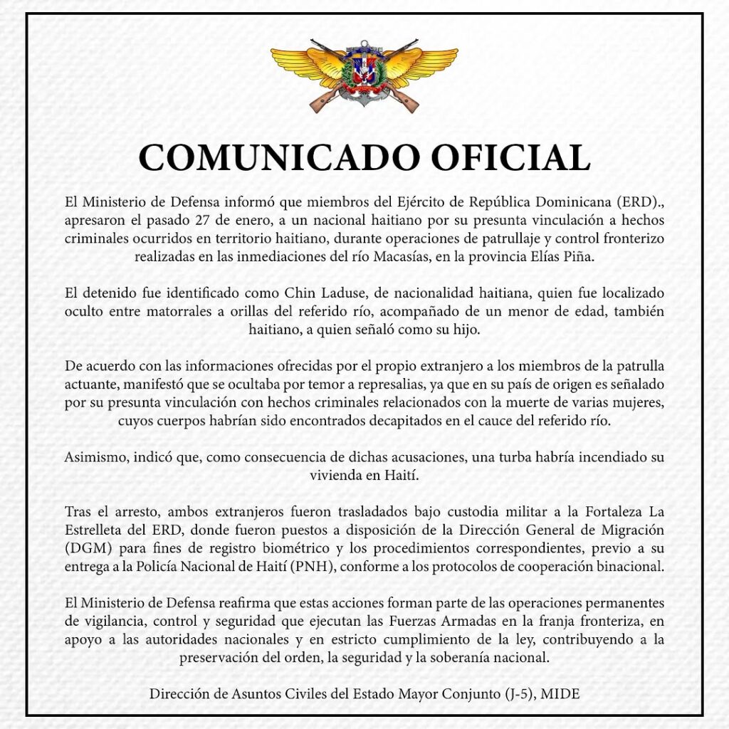 El Ministerio de Defensa apresaron a un nacional haitiano vinculado a hechos criminales durante patrullaje fronterizo en Elías Piña.
