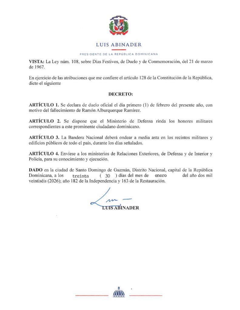 Santo Domingo.– Presidente Luis Abinader declaró duelo oficial 1 febrero 2026 por fallecimiento Ramón Alburquerque Ramírez, influyente dirigente político dominicano.