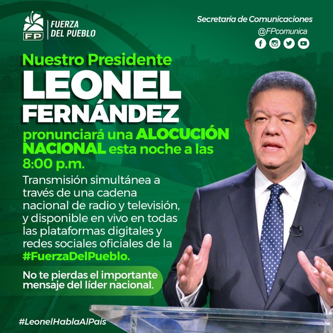 Leonel Fernández Reina, presidente de la Fuerza del Pueblo, se dirigirá esta noche a la ciudadanía mediante transmisión oficial en cadena nacional.