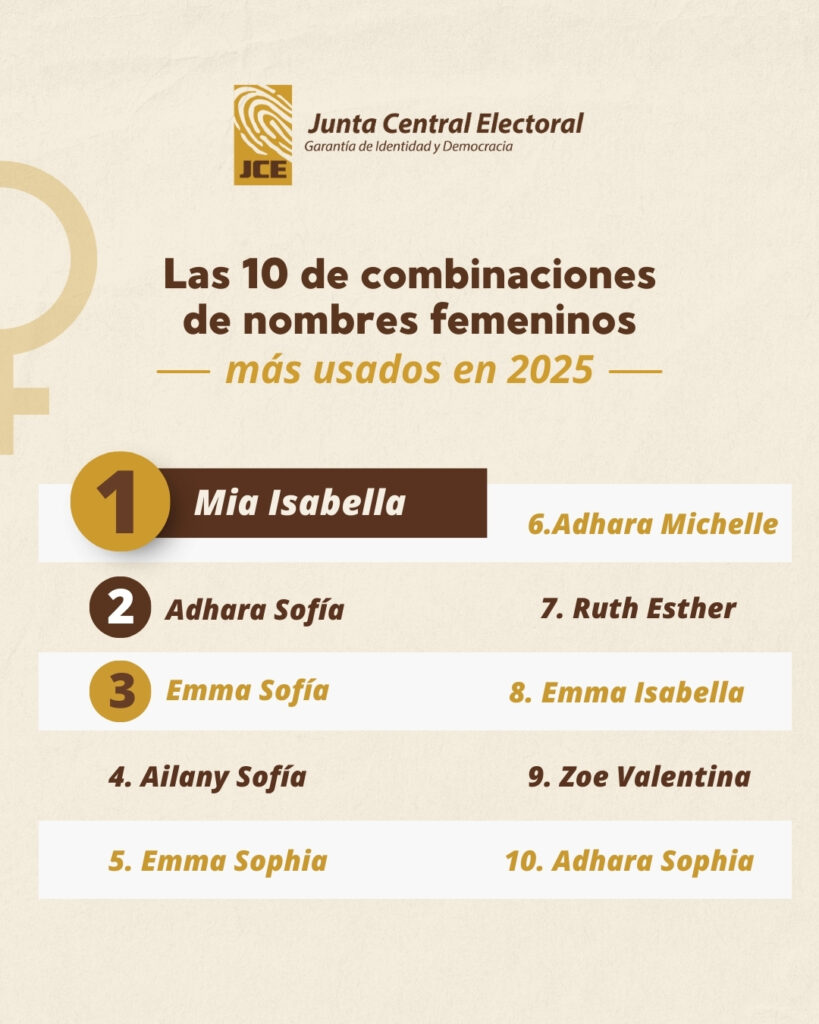 Combinaciones femeninas más comunes incluyeron Mia Isabella, Adhara Sofía y Emma Sofía, reflejando tendencias actuales de nombres en familias dominicanas.