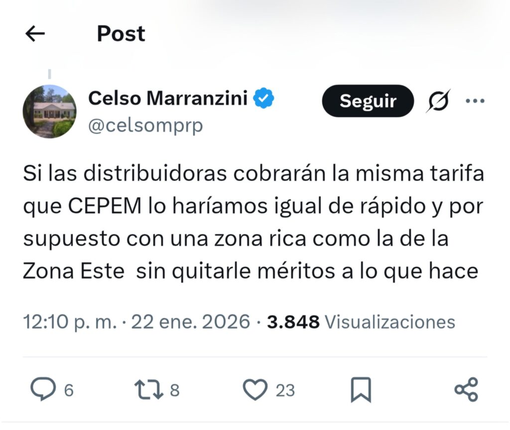 Marranzini afirmó que si las distribuidoras cobraran la misma tarifa que CEPM, podrían resolver los problemas de distribución eléctrica igual de rápido.