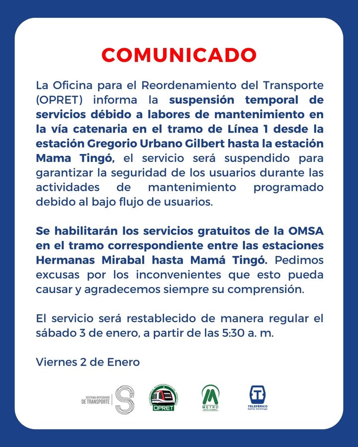 Santo Domingo.– Metro suspendió servicio temporal entre estaciones Gregorio Urbano Gilbert y Mamá Tingó, Línea 1, debido a labores mantenimiento vía catenaria.