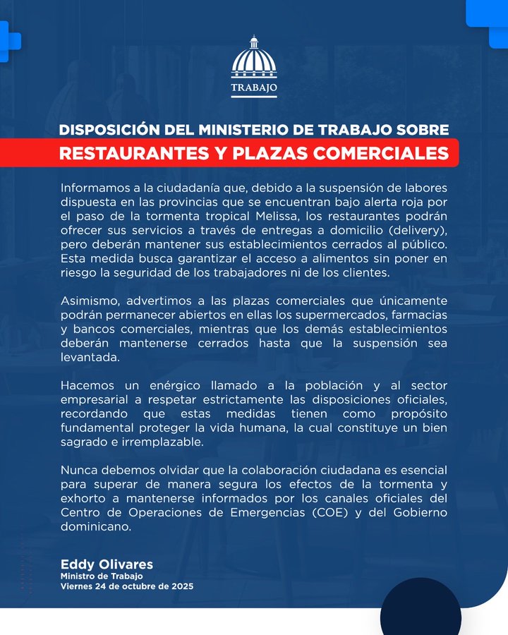 SANTO DOMINGO. – Como parte de las acciones coordinadas por el Gobierno dominicano frente a la tormenta tropical Melissa, el Ministerio de Trabajo informó este viernes que los restaurantes ubicados en provincias bajo alerta roja solo podrán operar mediante servicio de entrega a domicilio (delivery). Deberán permanecer cerrados al público hasta nuevo aviso.