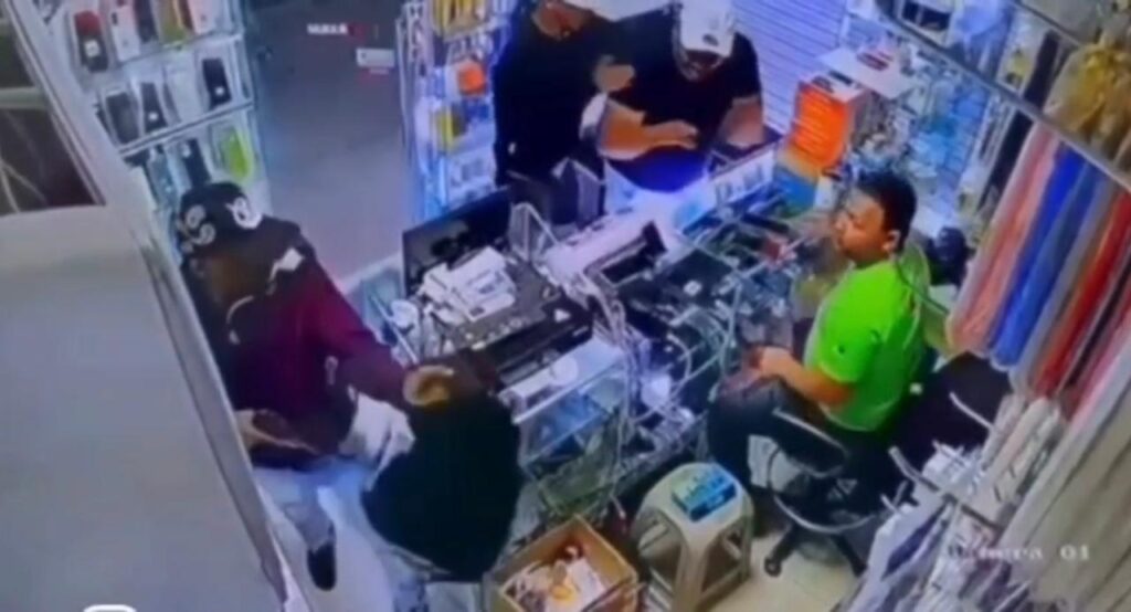 Cámaras de seguridad captaron el momento exacto en que dos sujetos armados ingresaron al establecimiento para robar varios dispositivos móviles dentro de una mochila.