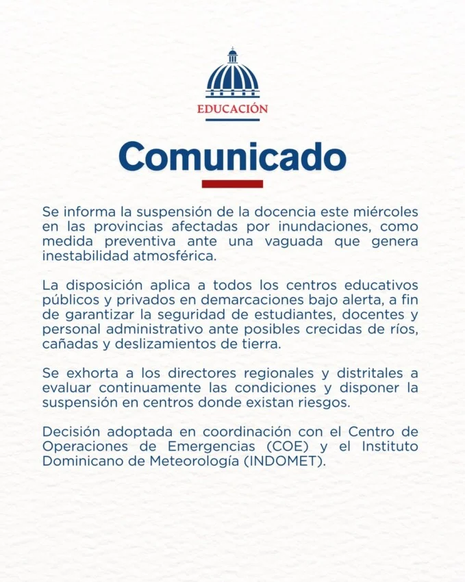Esta decisión administrativa responde a la inestabilidad atmosférica provocada por una vaguada que ha generado colapsos en el drenaje de la ciudad de Santo Domingo.