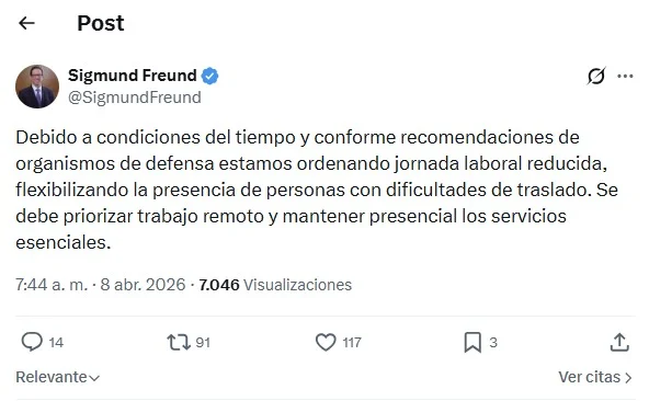 «Debido a las condiciones del tiempo y conforme a las recomendaciones de los organismos de defensa, estamos ordenando una jornada laboral reducida, flexibilizando la asistencia de las personas con dificultades de traslado. Se debe priorizar el trabajo remoto y mantener presenciales los servicios esenciales», escribió.