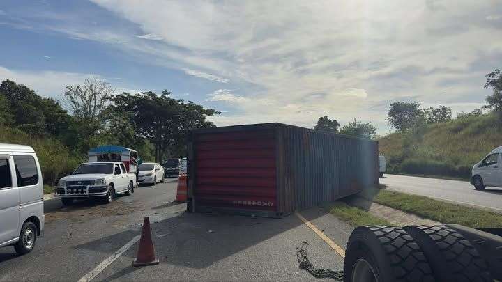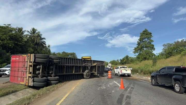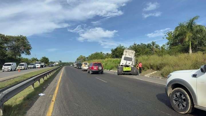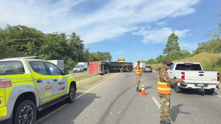 Santo Domingo. – Unidades de la Comisión Militar y Policial (Comipol) del Ministerio de Obras Públicas trabajan este viernes en el tramo II de la Circunvalación de Santo Domingo, luego de que un conductor de patana perdiera el control del vehículo, provocando que se deslizara y quedara atravesado, obstruyendo uno de los carriles de la vía.