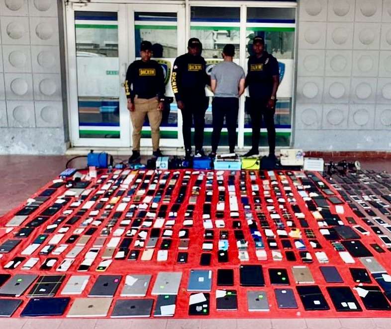 Policía Nacional y Ministerio Público confiscan más de 240 celulares y otros equipos electrónicos durante allanamiento en Santiago.