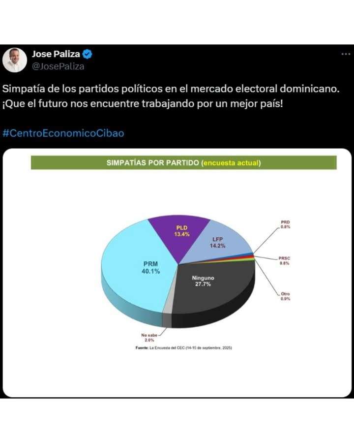 PRM lidera simpatía partidaria con 40.1 %, según datos compartidos por José Ignacio Paliza