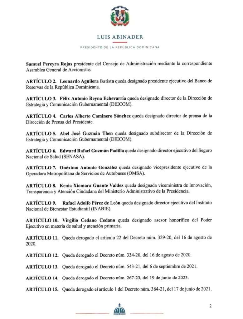 En la disposición presidencial se designa al doctor Samuel Pereyra Rojas como presidente del Consejo de Administración de la Refinería Dominicana de Petróleo (REFIDOMSA). Desde 2020 se desempeñaba como presidente ejecutivo del Banco de Reservas. Abogado de profesión, egresado de la Pontificia Universidad Católica Madre y Maestra, con especialidad en Derecho Comercial en la Universidad Panthéon-Assas de París, Pereyra ha trabajado en litigios de derecho corporativo, telecomunicaciones e inversión extranjera. Es miembro de asociaciones jurídicas en República Dominicana, Estados Unidos y Francia. Fue director de finanzas de la campaña presidencial de Luis Abinader y es miembro fundador del Partido Revolucionario Moderno (PRM).