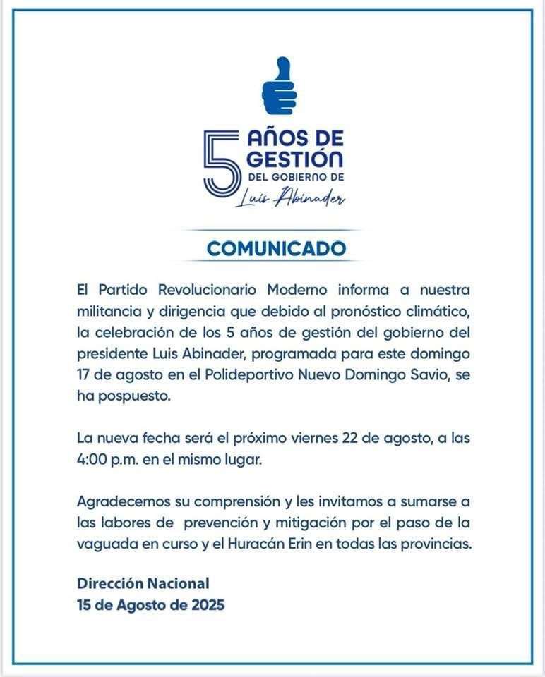 “El Partido Revolucionario Moderno informa a nuestra militancia y dirigencia que debido a las condiciones climáticas, la celebración de los 5 años de gestión del gobierno del presidente Luis Abinader. Estaba programada para este domingo 17 de agosto en el Polideportivo Nuevo Domingo Savio, se ha pospuesto”. Indica un comunicado.