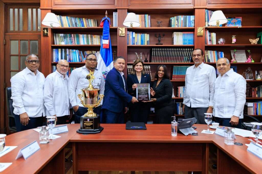 Santo Domingo, DN.- La vicepresidente Raquel Peña recibió de manera oficial la placa que la distingue con la dedicatoria del XVIII Torneo de Baloncesto Superior de San Juan, en un encuentro celebrado en uno de los salones del Palacio Nacional.