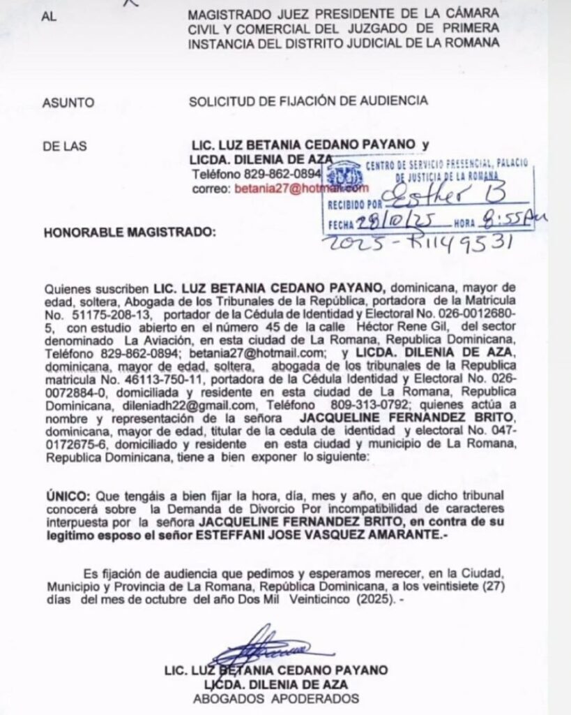 Santo Domingo.– La solicitud de fijación de audiencia presentada por la diputada de La Romana, Jacqueline Fernández Brito, quien está casada con Ethian Vásquez actualmente solicitado en extradición fue recibida el pasado 28 de octubre, la misma fecha en que se produjo el arresto de Vásquez.